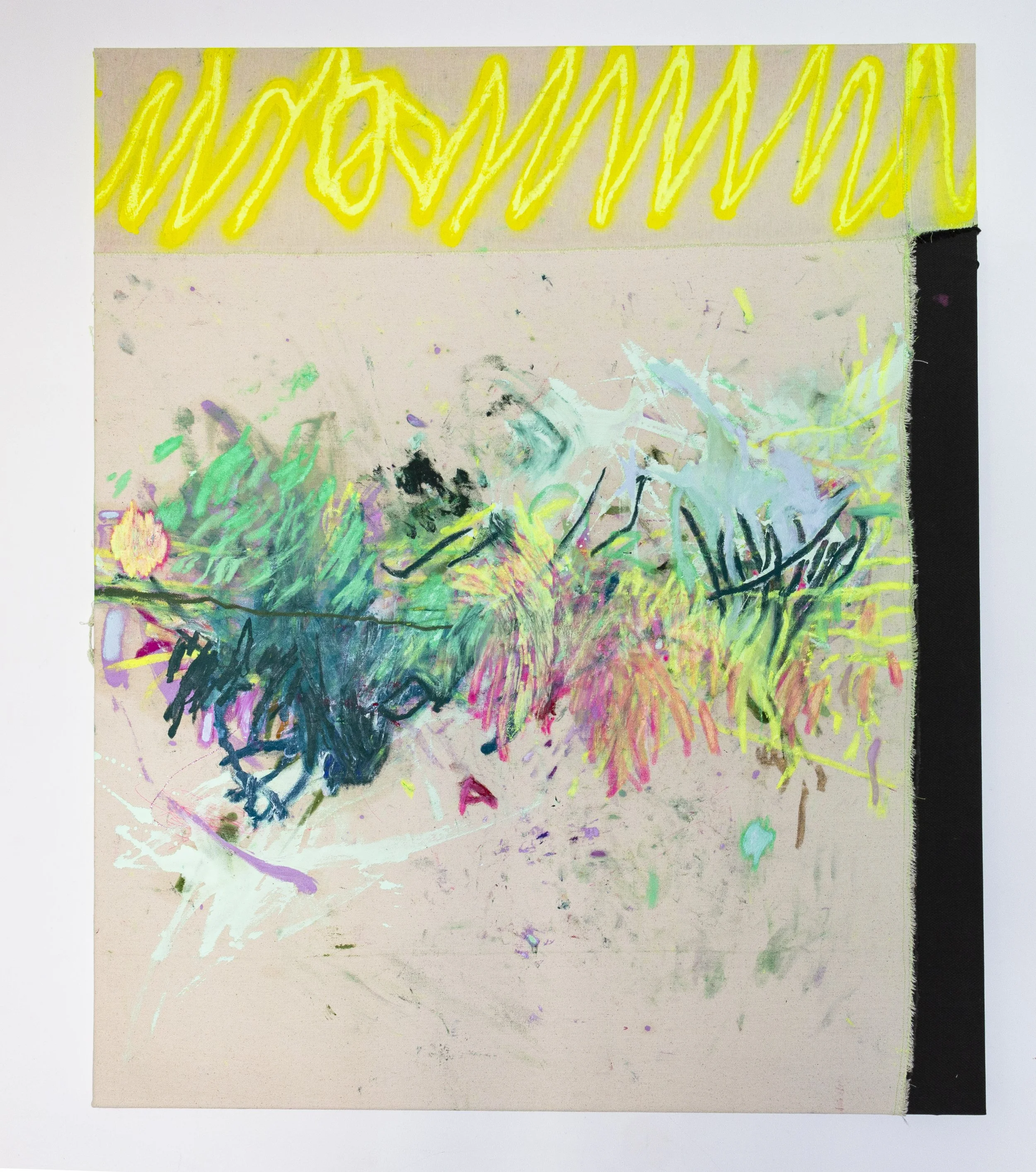 Yellow flowers and green bushes 2026, oilpastel, oilpaint and spraypaint on cotton, 100cm x 120cm